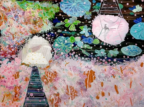 My recent series Metallic Leaf Garden explores the way individuals’ minds reshape their physical environment. Contemporary psychological theory allows that our consciousness, emotions, and subconscious can be akin to the “paint” that consistently colors our reality. My investigation incorporates a variety of individual psychological realms, depicting them in fictionalized surroundings that confuse the relationship between perception and reality. I utilize a mixture of expressionist/abstract aesthetics in a subtle, theatrical way to construct the characters’ environments, reflecting on their internal thoughts, struggles, personality, and/or problems.